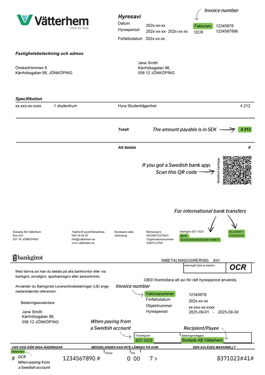 The rent is paid via your bank or at Vätterhem's head office. You can also pay via, for example, the following apps; Revolut, Trustly or Transferwise. It is important that you include your invoice number or OCR number.